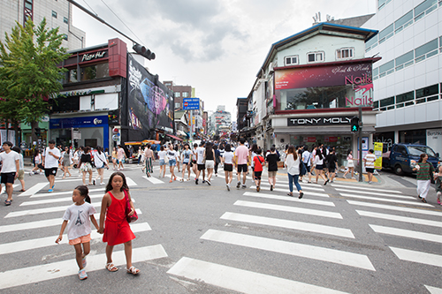 除此以外,从“想漫步的小径“到“停车场路”中间的路口据统计日平均人流量高达30万人次,然而以前却没有人行横道,在这个地方随意穿马路的现象最为严重。现在,这里也新增几个正对面及对角线的斑马线,大大方便了游人。韩国旅游必去的弘大越来越便利了!