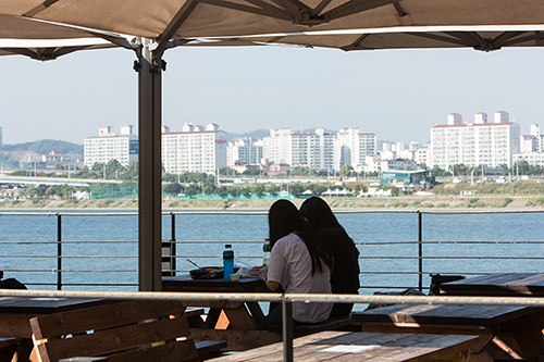 人们坐在汉江边上,一边吹着凉爽的秋风,一边看风景、吃零食,甚是悠闲惬意!