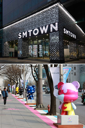 由SM娱乐公司出资兴建,出售旗下偶像明星周边、进行展览、演出及体验MV拍摄的场所——SMTOWN@coexartium(上图)和位于江南狎鸥亭,聚集了许多K-POP艺人暴力熊人偶的K-Star ROAD(下图)均光荣上榜。