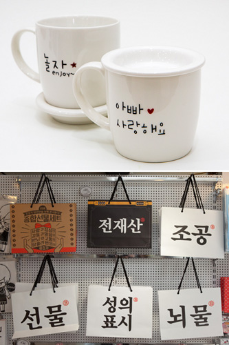 另外,在光化门广场地下的韩文世界 光华门店(上图)和仁寺洞的Noldakage Ssamziegil店(下图)中,可以买到印有韩文图样的马克杯和礼品袋等周边产品。今天好好与韩国固有文字——韩文,来次亲密接触吧!