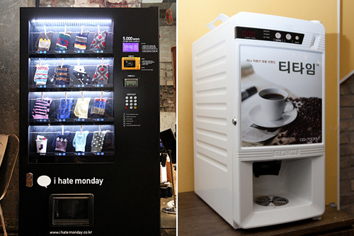 韩国的自助服务较为发达,各式各样的自动贩卖机(左图:袜子自动售货机、右图:自助咖啡机)设置在城市的各个角落,为当地人的生活和游客的出行提供着方便。