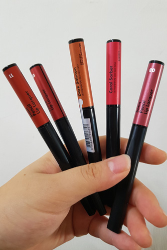 “ARITAUM”的新品Satin Pencil唇釉,所有12色(图为其中5色,各8,000韩元)都为偏暖色调。其中砖红色(11号)、浅豆沙色(01号)及浅紫色(03号)最为畅销。