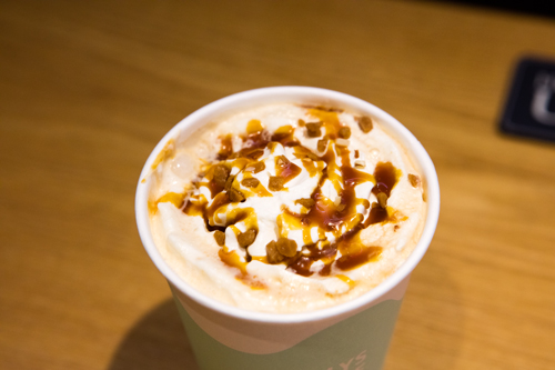 “豪丽斯咖啡(HOLLYS COFFEE)”的冬日限定拿铁“Toffee Delight”(5,700韩元)中焦糖和坚果的相遇,是其最大的特点哦!