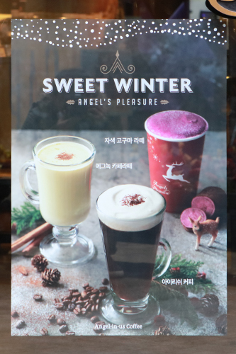 “安琦丽诺咖啡(Angel-in-us Coffee)”推出的圣诞节暖心限定饮品“蛋奶咖啡拿铁(图左、5,300韩元)”将会销售到明年2月5日。与在去年同期推出的人气拿铁“紫薯拿铁(图右、5,000韩元)”一样,入口甘甜、浓香四溢。