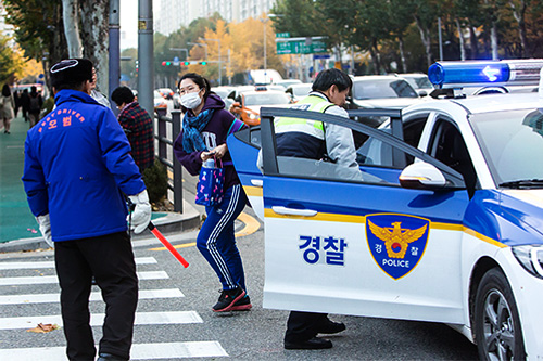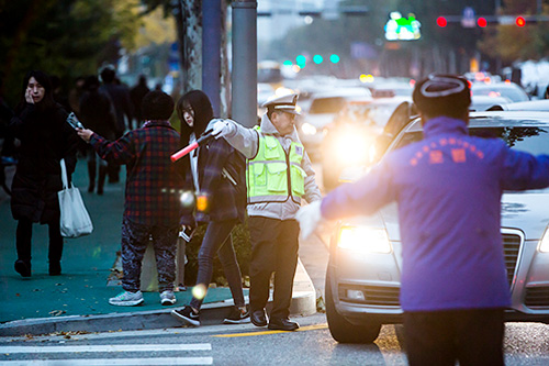 今早考场周边的干线和道路都进行了交通管制。由于今早使用公共交通的人次增多,部分企业甚至将上班时间变更为10点,以避免人潮拥挤与路况堵塞的不便。在OECD加盟国中,升学率位居第1名的超学历社会可说是韩国特有的现象。