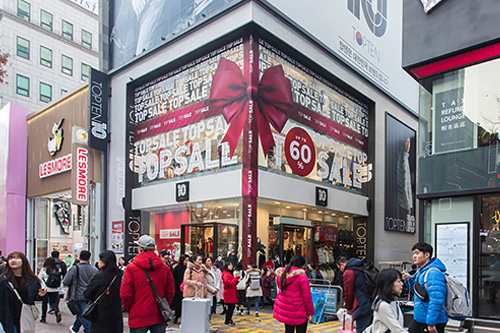 韩国一年中会有几次大型打折季,从圣诞节前夕到次年年初的打折季尤为热闹!走在圣诞节气氛浓郁的明洞大街上,能够看到几乎每家店铺都贴满了红色折扣标牌。
