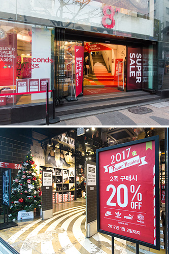 “8IGHT SECONDS”(上图)以“SUPER SALE”为标语,展开冬季服装折扣活动。在鞋店“FOLDER”(下图)购买“耐克”、“阿迪达斯”等品牌运动鞋也大有折扣。