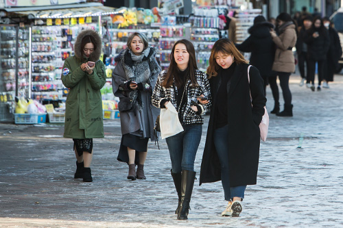走到韩国年轻人的最爱地点弘大,可以看到白白的积雪正在慢慢融化。