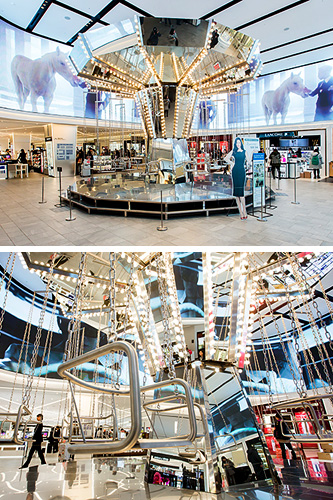 全智贤、李敏镐主演的热门韩剧《蓝色海洋的传说》一剧中,全智贤坐秋千的一幕便摄制于韩际新世界免税店10层的“Mirror Carousel"。环绕在旋转木马秋千的360°全景数码墙上随时播放宣传影像。华丽的照明让人仿佛置身幻想中的童话世界。