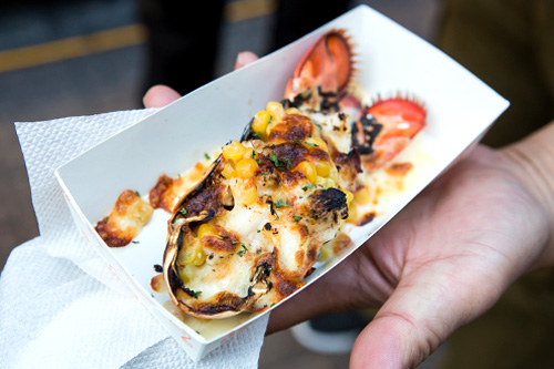 烤龙虾(15,000韩元) 明洞街头人气第一的小吃,浇上奶酪后现场直火烤制。