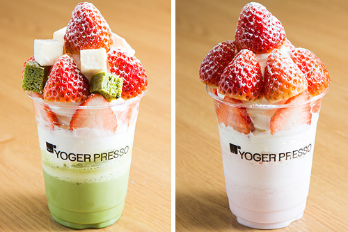 韩国酸奶甜品连锁店“YOGER PRESSO”推出由绿茶、芝士口味蛋糕点缀的“Merry树”(左图,7,200韩元)和草莓与酸奶酸甜结合的“Merry 草莓”(右图,6,000韩元)。可爱的外形引爆韩国SNS。