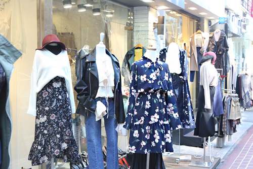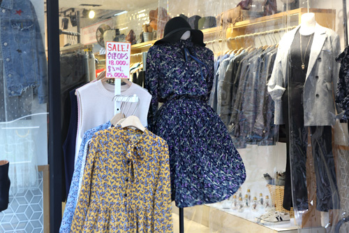 弘大服装店新款春装。花裙配上小毛衣,即是最近流行的服装搭配。