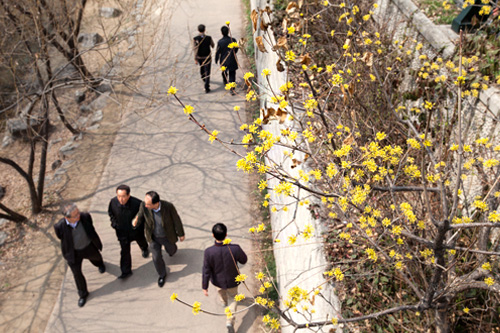 最近,首尔最高气温升至10度以上,山茱萸也开花报春了。
