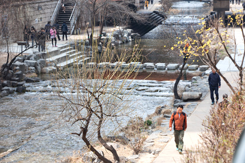 暖暖的天气里,在清溪川畔悠闲散步的人越来越多。