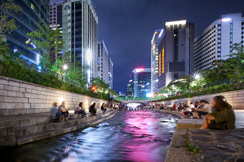 清溪川流淌在首尔市中心,临近明洞的河畔是深受市民喜爱的休憩场所。