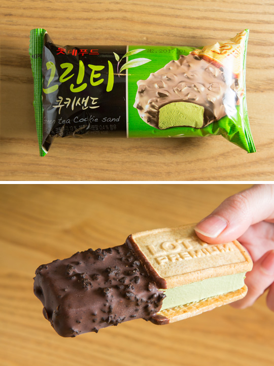 CU便利店的热卖产品“绿茶饼干三明治”(2,000韩元),甜度适中,绿茶冰激凌上一半包裹脆皮巧克力,一半包裹饼干,可以尝到两种美味。