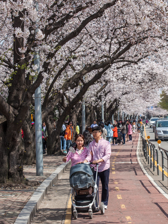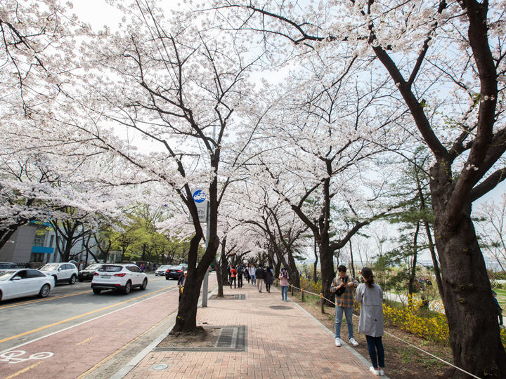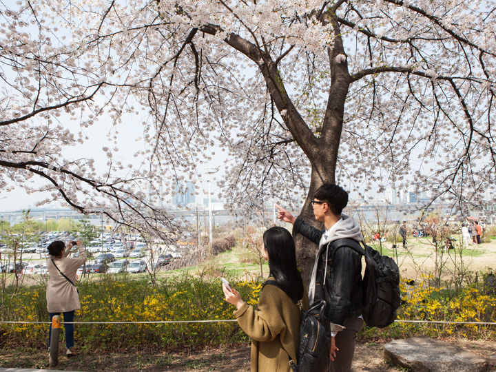 盛开的樱花,更是吸引很多年轻的韩国情侣,漫步在樱花树下赏春赏樱。