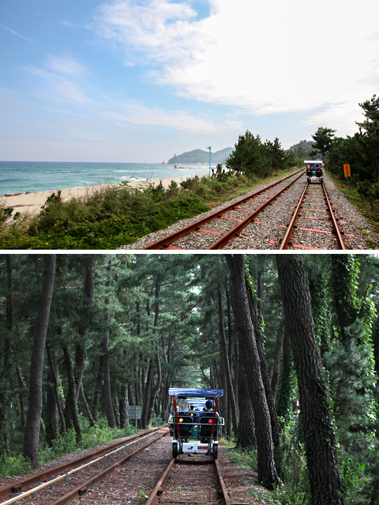 在江原道东海岸的三陟海洋骑铁路自行车,穿过黑松林即是一望无际的蔚蓝大海。