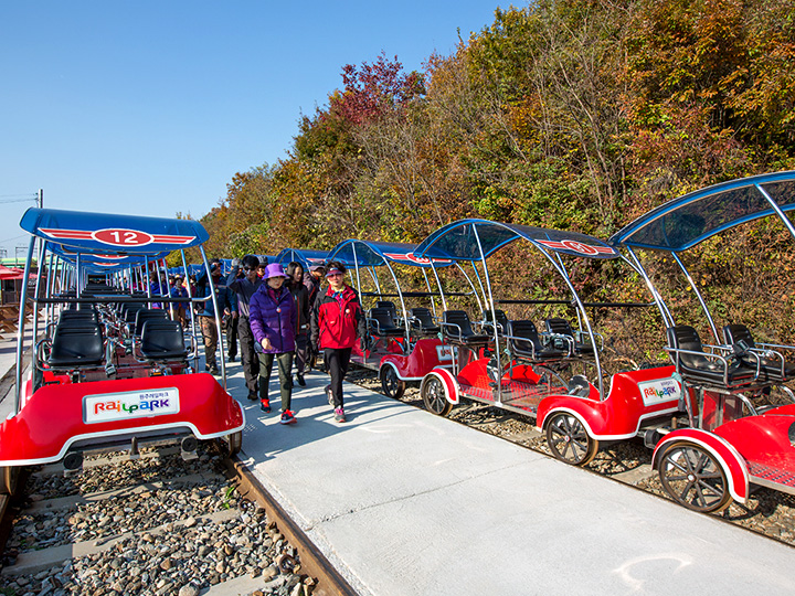 在因南怡岛而著名的江原道春川市,也可以乘坐铁路自行车(江村铁路自行车)。