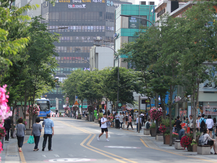 韩国气温渐高,进入夏日的新村街头