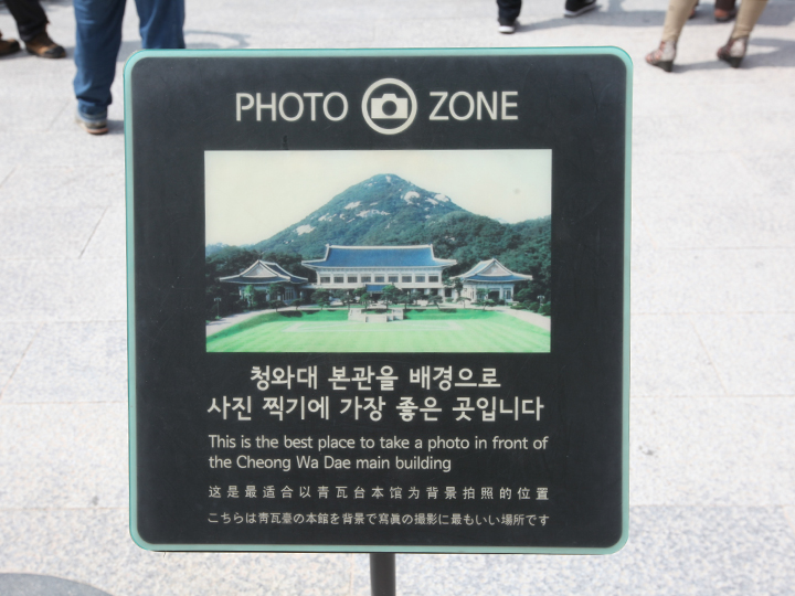 韩国政府还设置了“以青瓦台为背景的最佳拍照点”标牌(如图),方便市民游客以此为标记拍照留念。
