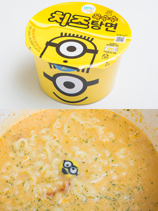 芝士满满的“玉米芝士泡面”(1,500韩元/盒)。在微波炉里转3分钟,芝士汤会更加浓香美味。里面还有可爱的小黄人鱼饼!