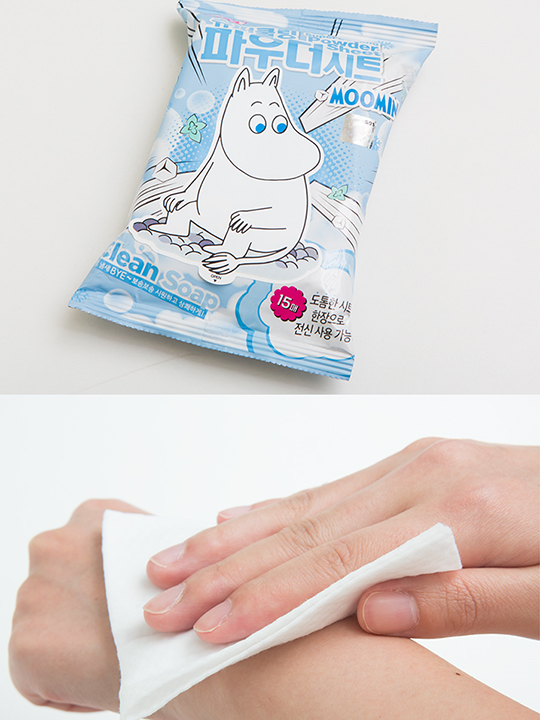 “Ms.44”与卡通形象“MOOMIN姆明”合作推出的“Super Cooling Powder Sheet湿巾”(4,900韩元/15片),清清凉凉。不论走到哪里,轻轻一擦就能解决汗味与黏腻感的烦恼,绝对是夏日外出必备物品!