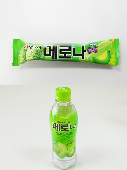 今夏的韩国充斥着哈密瓜的味道,多种新商品大受欢迎。宾格瑞公司继招牌雪糕“Merona”(上图,1,000韩元)之后,新推出了“Merona Jeju Sparkling”饮品(下图,1,500韩元),在甜蜜清香的哈密瓜口味中加入了爽口的碳酸气泡。CU便利店和各大超市里都有出售。
