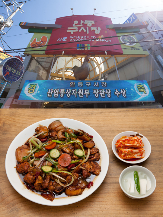 韩国各地传统市场因为地域特征,各有各的特色。今天来盘点一下韩国市场里的特色小吃!位于庆尚北道安东市的“安东旧市场”可谓安东炖鸡的天堂,仅通过市场门脸前威武的大公鸡就可以略见一斑了。