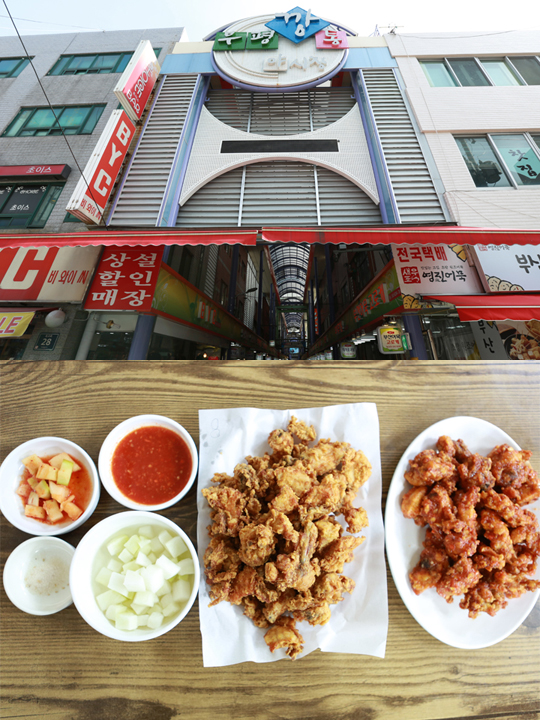釜山中区“富平罐头市场”内的“巨人炸鸡”(下图)是市场内的招牌,以“釜山三大炸鸡”之称享誉釜山美食界。另外,这里也是釜山的常年夜市,夜间来此,可以品尝自世界各地的名优小吃。