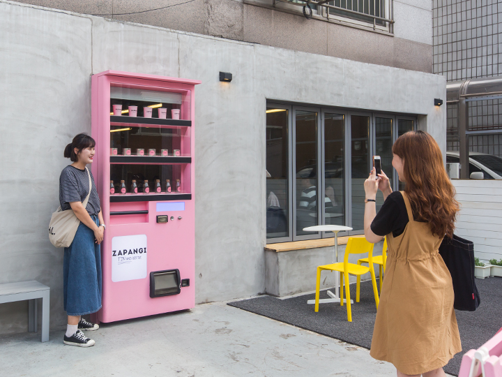 当你来韩国旅游时,可能会注意到街边或者地铁站有不少自动贩卖机。除了卖饮料、饼干,还有很多新奇的自动贩卖机。首尔新兴观光景点“望理团街”聚集着众多文艺系甜点美食店。其中以粉色咖啡贩卖机闻名的“ZAPANGI”更是SNS上的热门拍照景点,很多网红、明星都忍不住在这里拍照留念。