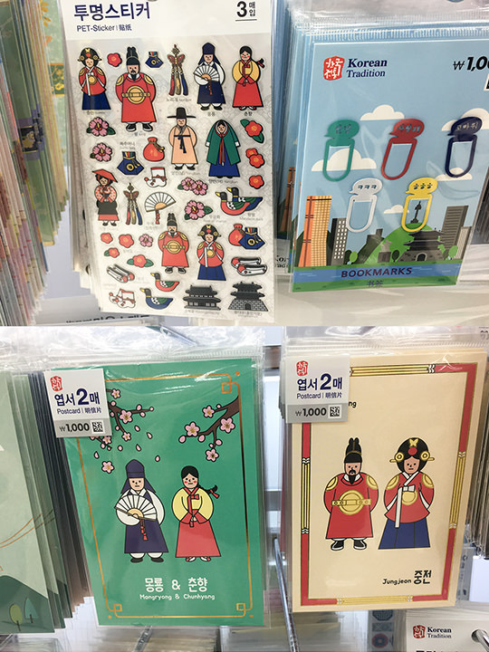 透明的韩国元素贴纸(上图左)、写有韩文的铁质书签(上图左)和印有韩国传统人物的明信片(下图),韩国风十足。售价均为1,000韩元。