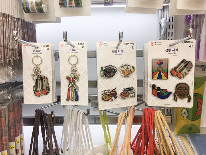 韩国传统元素钥匙扣(图左,1,000韩元/个)和外国旅游经常买的纪念品——冰箱贴(图右,1,000韩元/4个)性价比超高!