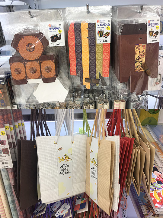 印有韩国特色图案的包装盒和韩国传统纸——韩纸制作的礼品带,干净简洁。可以把韩国旅游礼品包装好送给小伙伴。售价也只要1,000韩元。