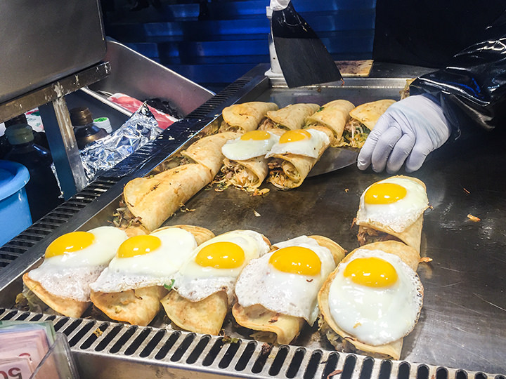 这个包菜蛋包饼,仅凭其华丽丽的外观就诱惑了不少人的视线和胃口。将包菜丝与多种蔬菜一起爆炒好以后,裹在薄薄的煎饼里,然后再在上面加一个煎蛋。做好后会切成方便吃的大小块儿放入纸盒里,上面还会淋上特制的调味酱汁,售价5,000韩元/1个。