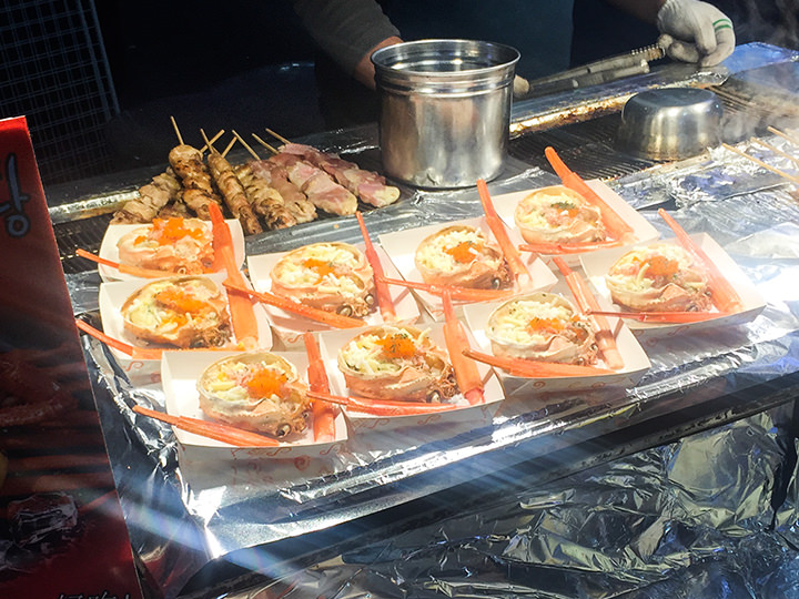 在这个蟹肥的季节,摆在街头的雪蟹格外撩人。这个奶酪雪蟹焗烤,在蟹壳里放入了新鲜的蟹肉、蔬菜及大量的奶酪,现场直火烤制,用小勺子充分搅拌后入口,雪蟹的鲜香味和浓郁的奶酪味融合在一起,叫人称赞,仅售3,000韩元/1个。