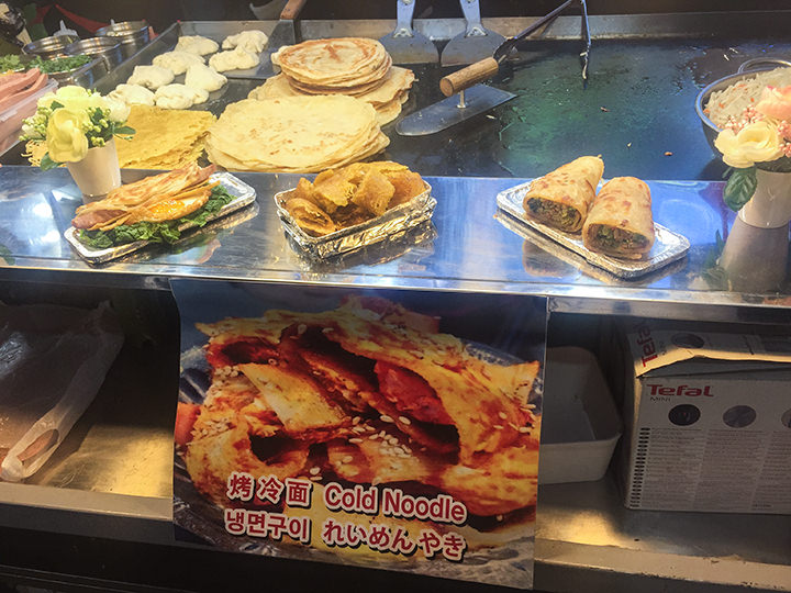 在中国小吃中也存在着的烤冷面,现在也能在明洞街头吃到啦,售价4,000韩元/1份,来尝尝味道有没有什么不同吧。值得一提的是,这些明洞小吃摊一般在16:30以后出摊,现在的明洞晚上一片圣诞气氛,所以大家最好晚上来玩购吃,度过精彩的时间哦!