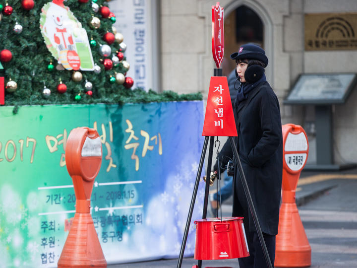 圣诞节明洞购物街上,醒目的红色慈善锅吸引着人们的眼球。活动中募集到的资金,将为老年人和残障人士,还有一些生活困难的家庭提供援助。