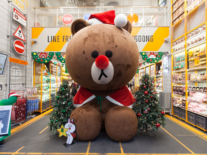 圣诞节脚步日益临近,位于人气景点明洞的“LINE FRIENDS STORE”的LINE公仔布朗熊穿上了可爱的红色圣诞装。来韩国旅游时,可一定要到明洞感受一番韩国圣诞节的气氛哦。