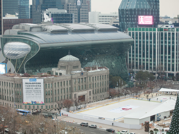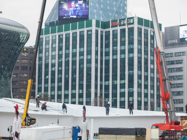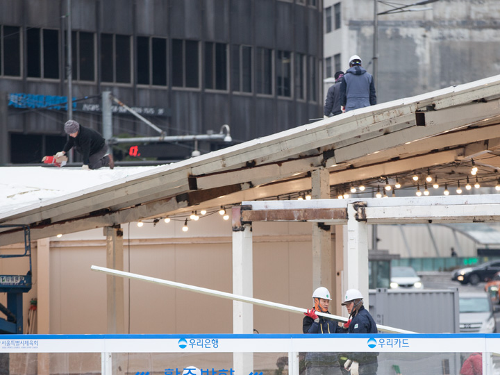 如果您现在去首尔广场,会看到一片紧锣密鼓施工的景象,这么冷的天,猜猜他们是在做什么工程呢?