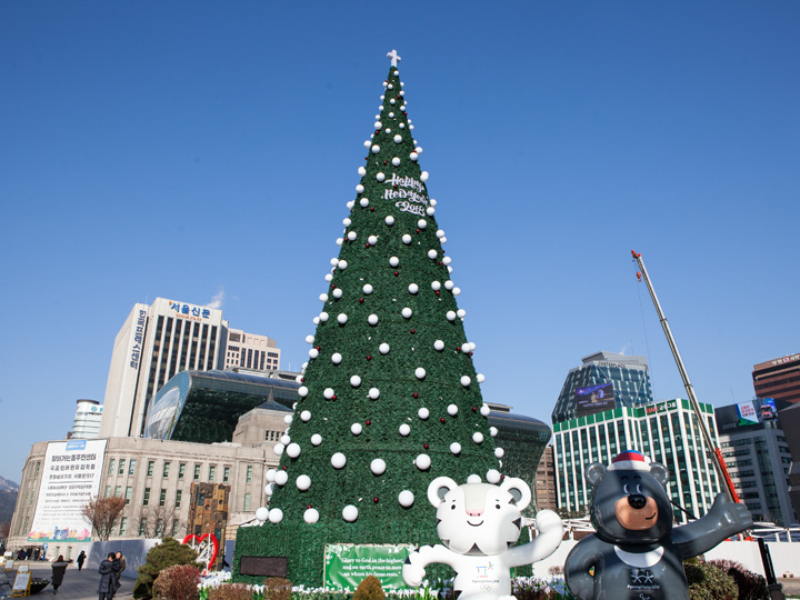 在首尔广场的一侧,还有巨型圣诞树及迎接2018平昌冬奥会的吉祥物白虎和半月黑熊。一片韩国冬季欢乐腾腾的气氛,大家可以安排旅游日程来体验体验哦!