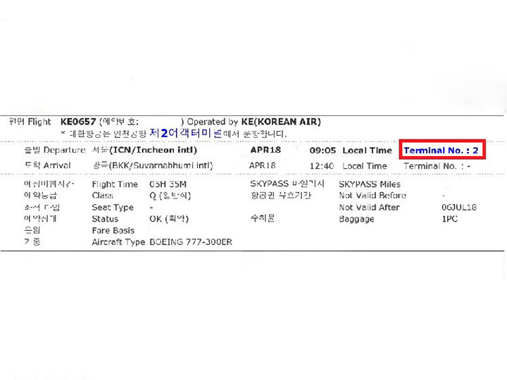 例如,机票上“Terminal No.”(照片右上红框的位置)会标示着航站楼号。