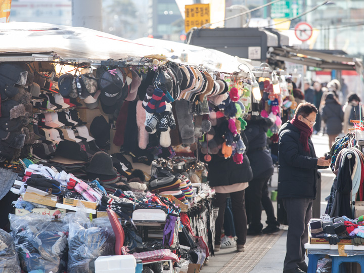 手套、围巾等冬季保暖单品店铺沿着东大门购物街道一字排开。来到韩国旅游,如果忘了准备防寒物品,也可以在当地采购。