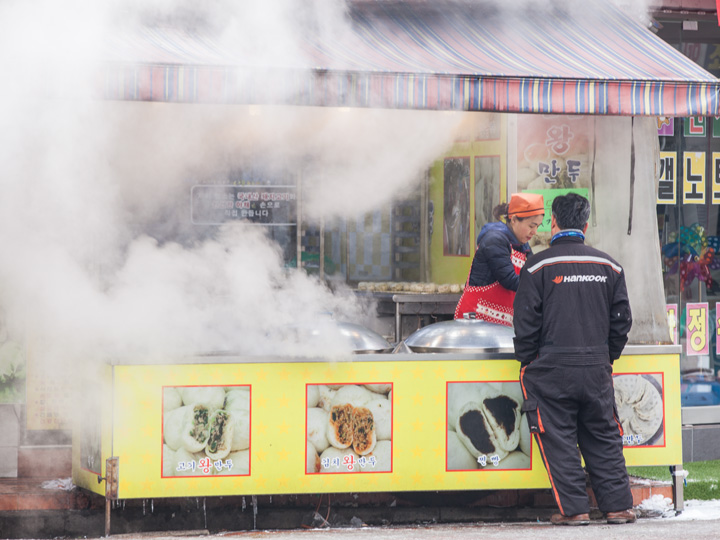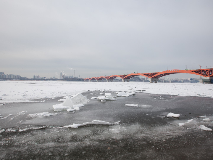 不只在首尔的街道是雪白的样子,连流经首尔中心的汉江也在寒冷中冻结了,可以看到冻结的汉江。