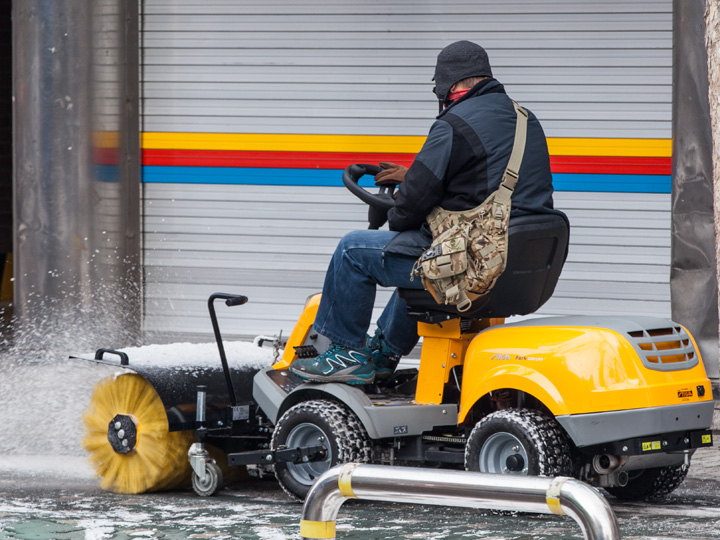 在道路和屋檐下,可以看到在扫雪机上工作的人们,或是清扫雪的模样。
