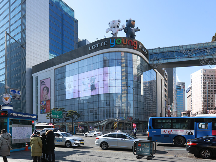 位于明洞中心的“乐天Young Plaza 明洞店”是乐天百货系列的时尚大厦。 许多在10~20几岁的年轻人中流行的时装、化妆品和杂货铺入驻于此。