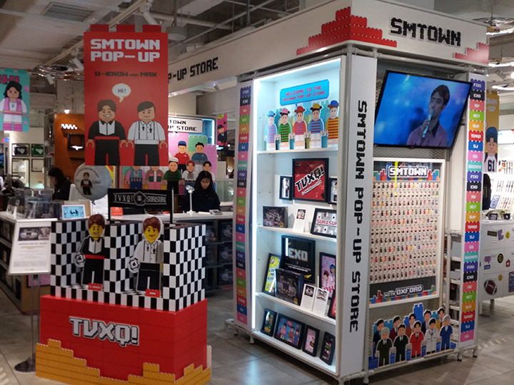 在一层会有限定时间内售卖的概念商店。从去年12月开始售卖了关于东方神起和EXO的现场直播会场和MV为主题的钻石积木系列。