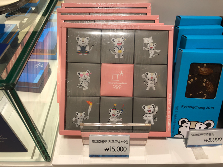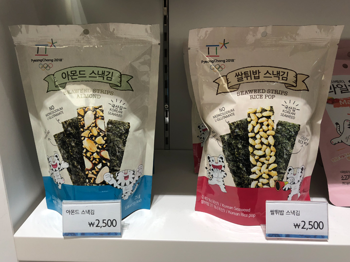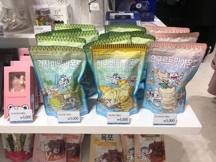 平昌冬季奥运会在上周开幕,在官方商店里陈列着很多极具代表性的韩国纪念品。在国内受中国消费者喜爱的蜂蜜黄油杏仁(照片中间),还有芥末味(照片左侧)和酸奶味(照片右侧)。(每包5000韩元)