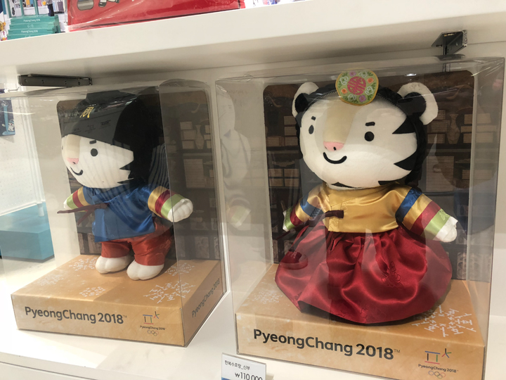 穿着韩服的冬奥会吉祥物(每个110,000韩元), 可以说是萌翻天!