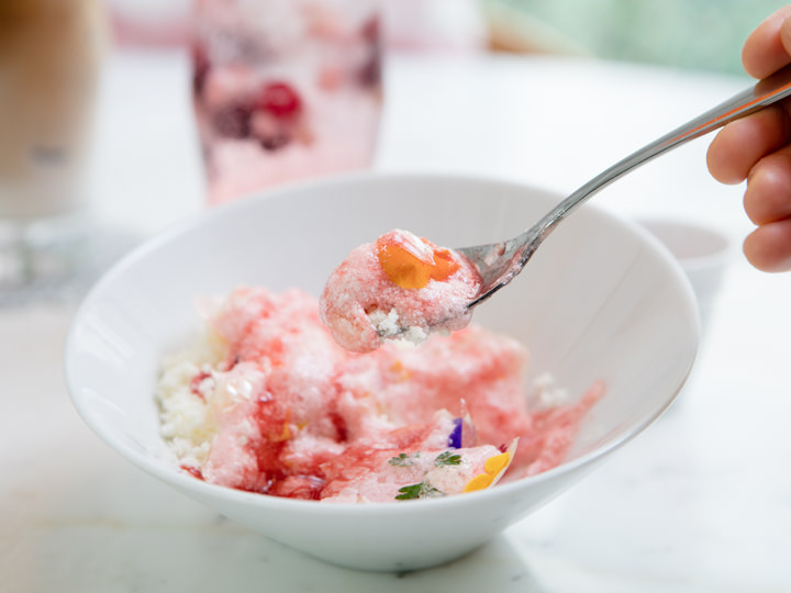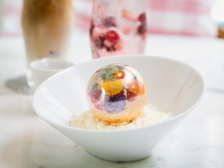 用勺子将糖球敲碎,水果与鲜花溢出,浇上草莓汁,与底下的芝士蛋糕一起放入口中,酸酸甜甜与奶香味蔓延,刺激着味蕾,甜美无比!